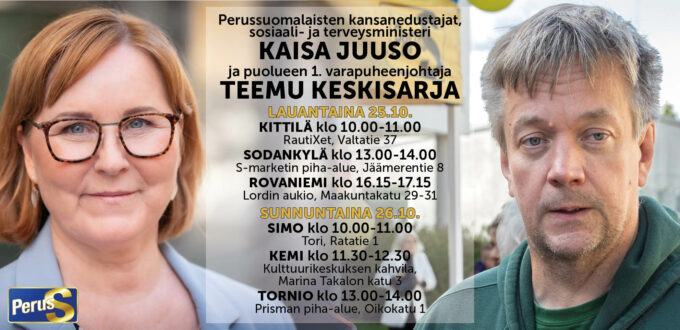 Sosiaali- ja terveysministeri Kaisa Juuso sekä Perussuomalaisten 1. varapuheenjohtaja Teemu Keskisarja Simossa 26.10.2025